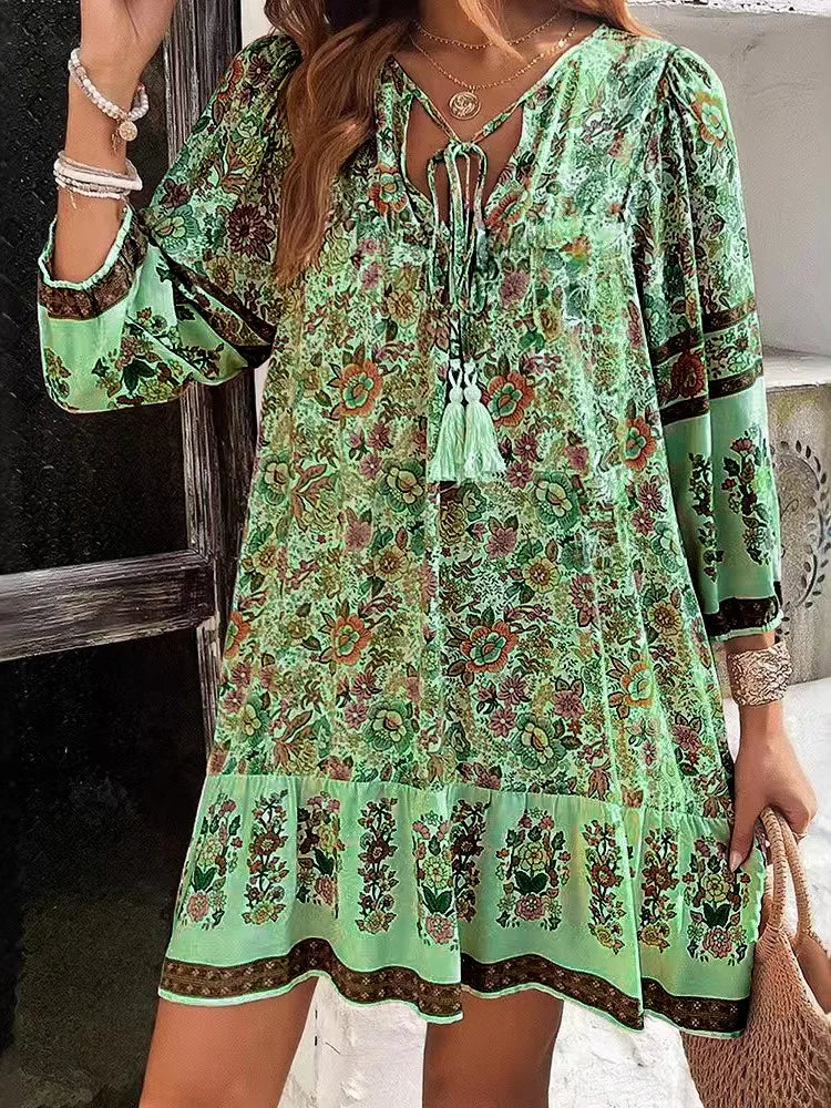 BohoLace™ | Vintage Printed V-Neck Lace-Up Loose Dress