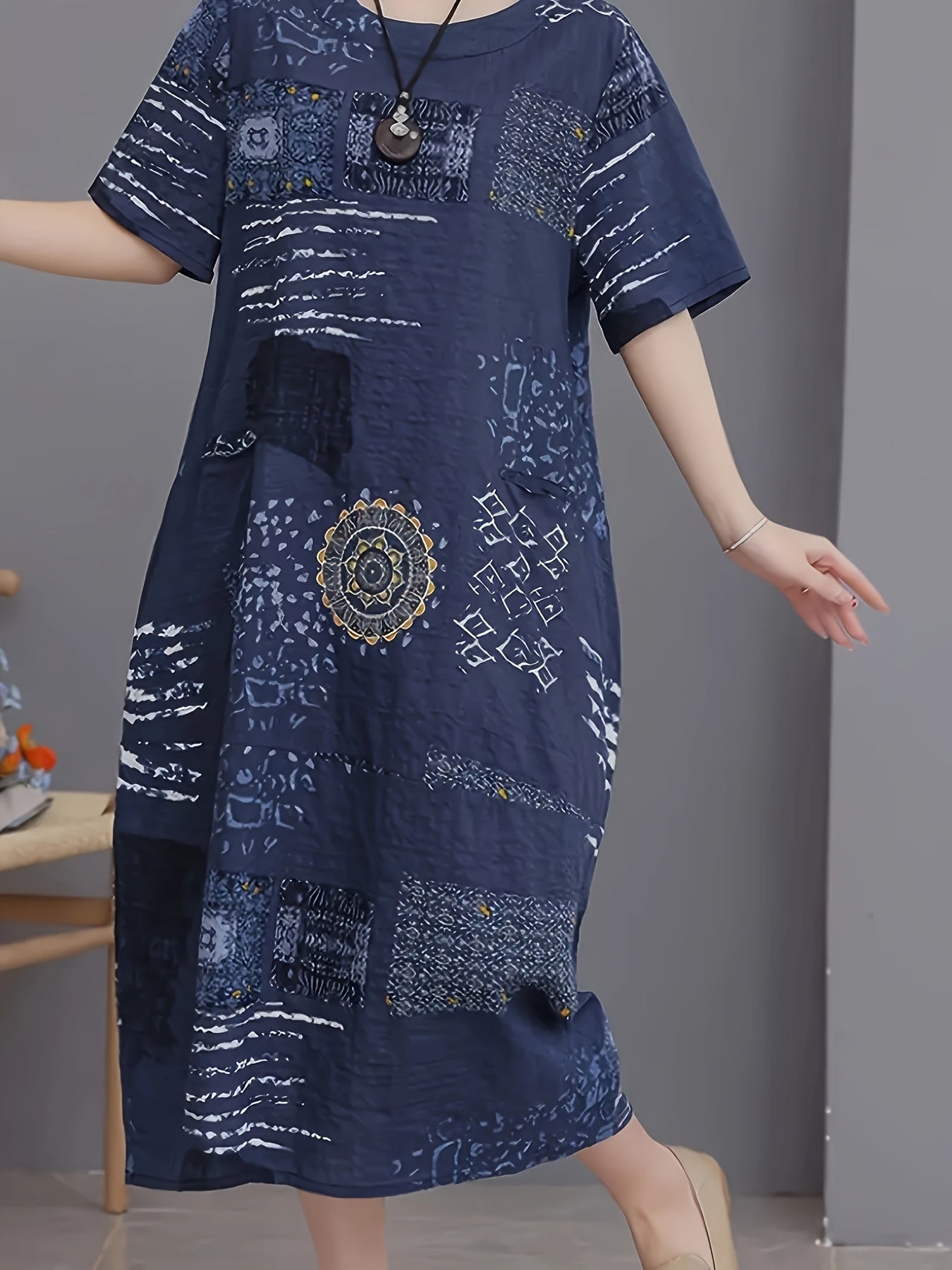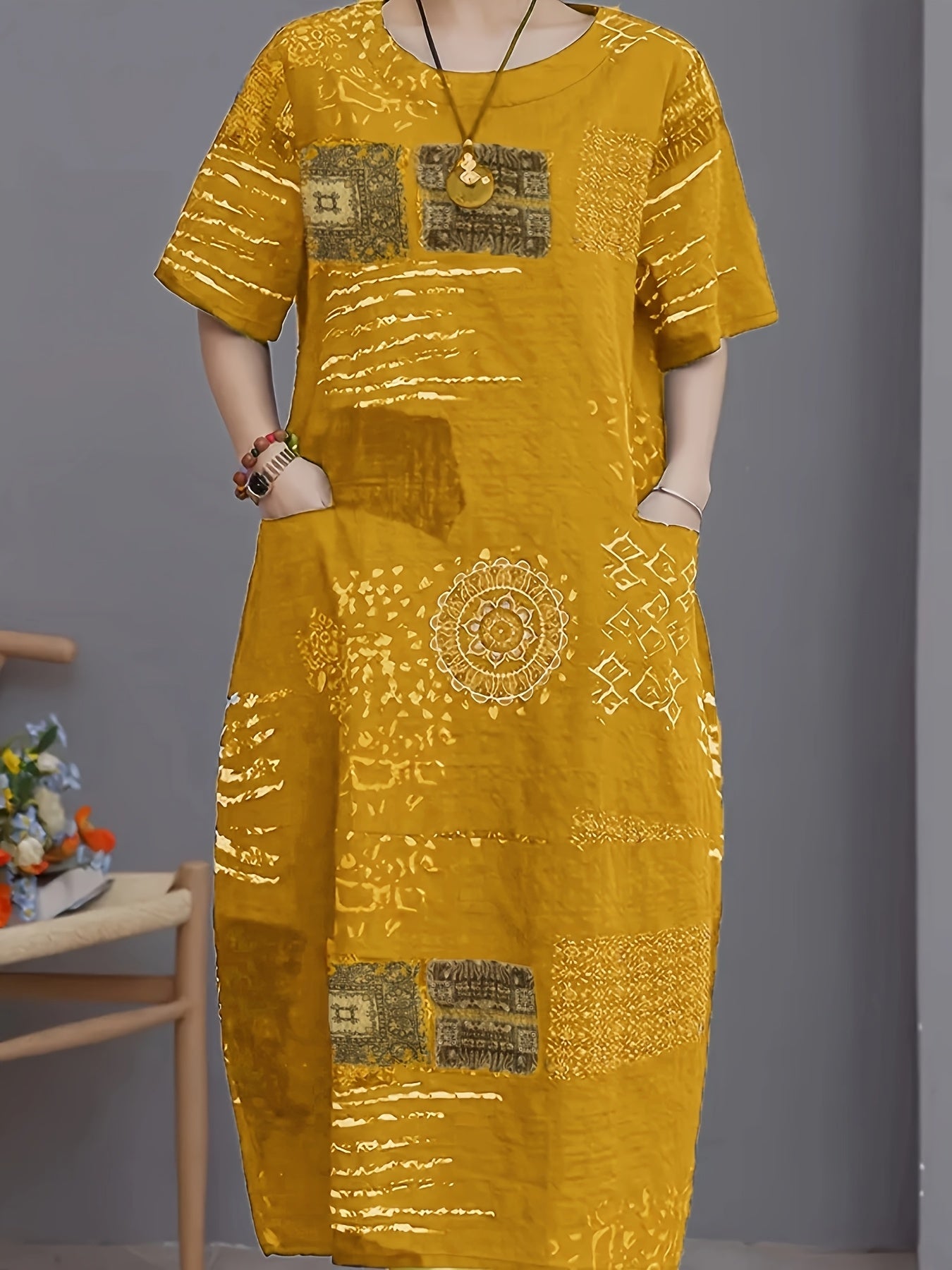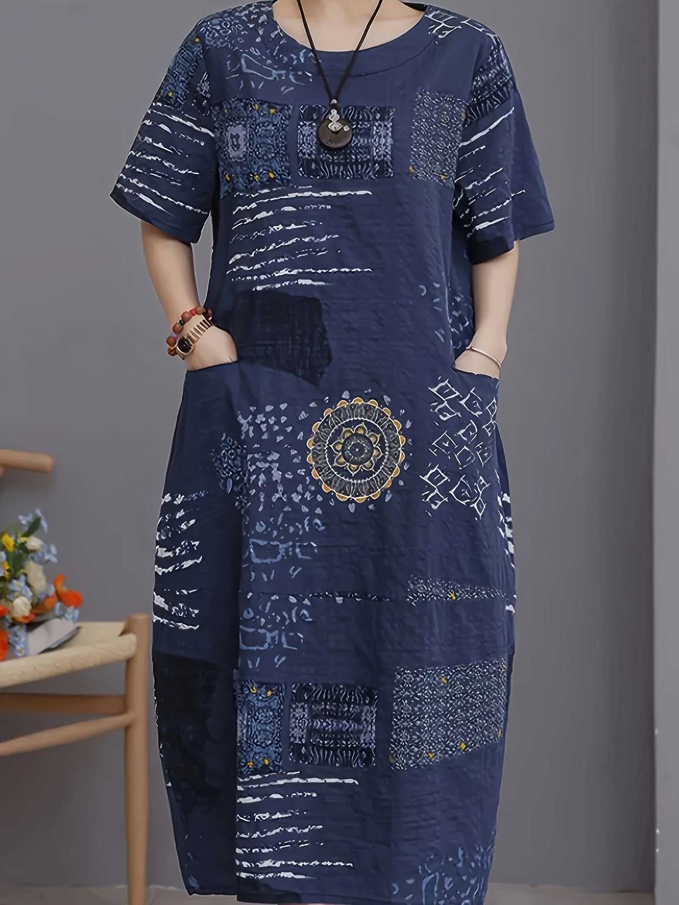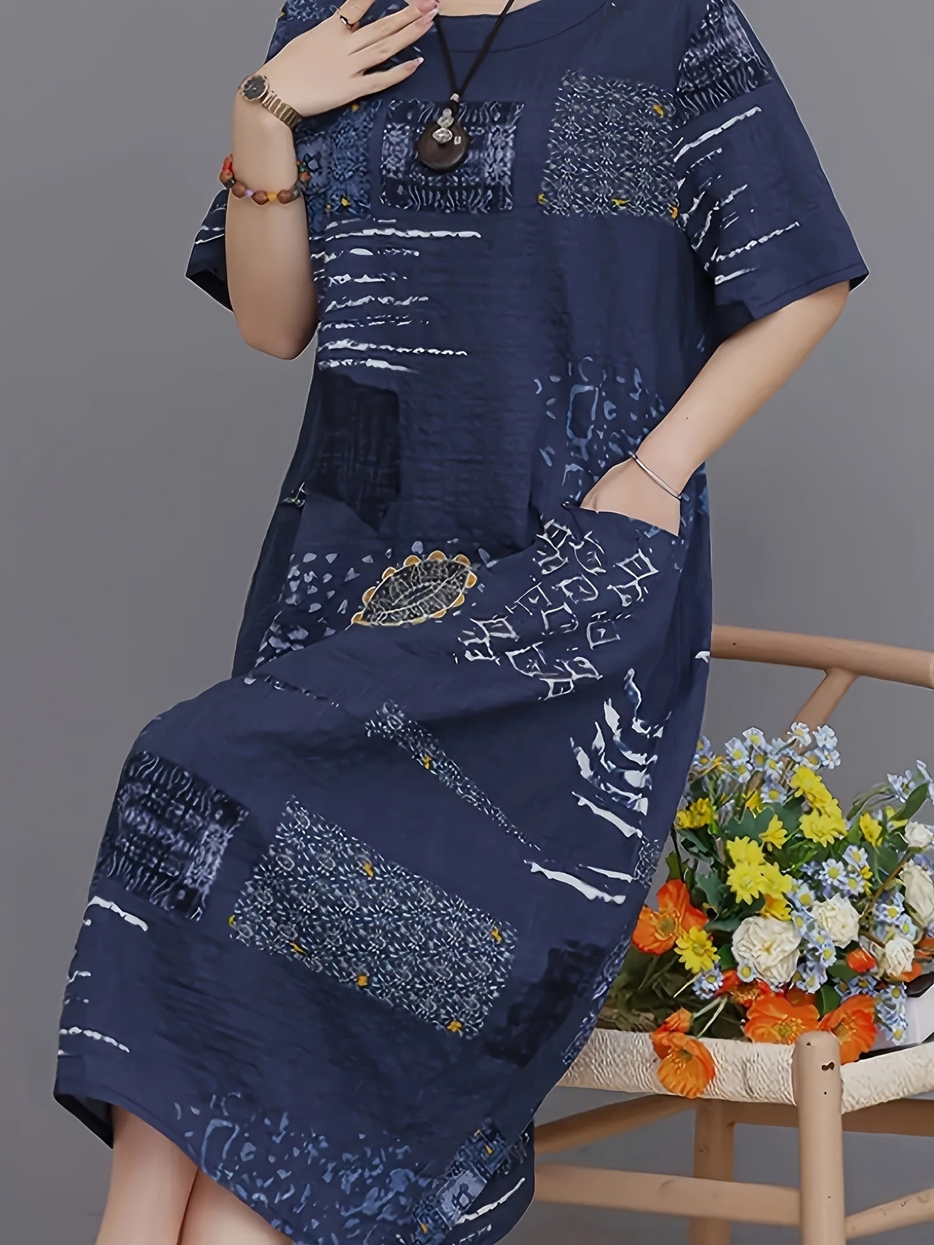 The Calyra PocketFlow Boho Midi Dress is designed for effortless spring and summer styling with a relaxed yet polished feel. Featuring a classic round neckline, short sleeves, and a flattering A-line silhouette, it offers an easy fit that feels comfortable while maintaining a smart-casual look. The mid-length cut adds versatility, making it suitable for both daytime outings and relaxed evenings.