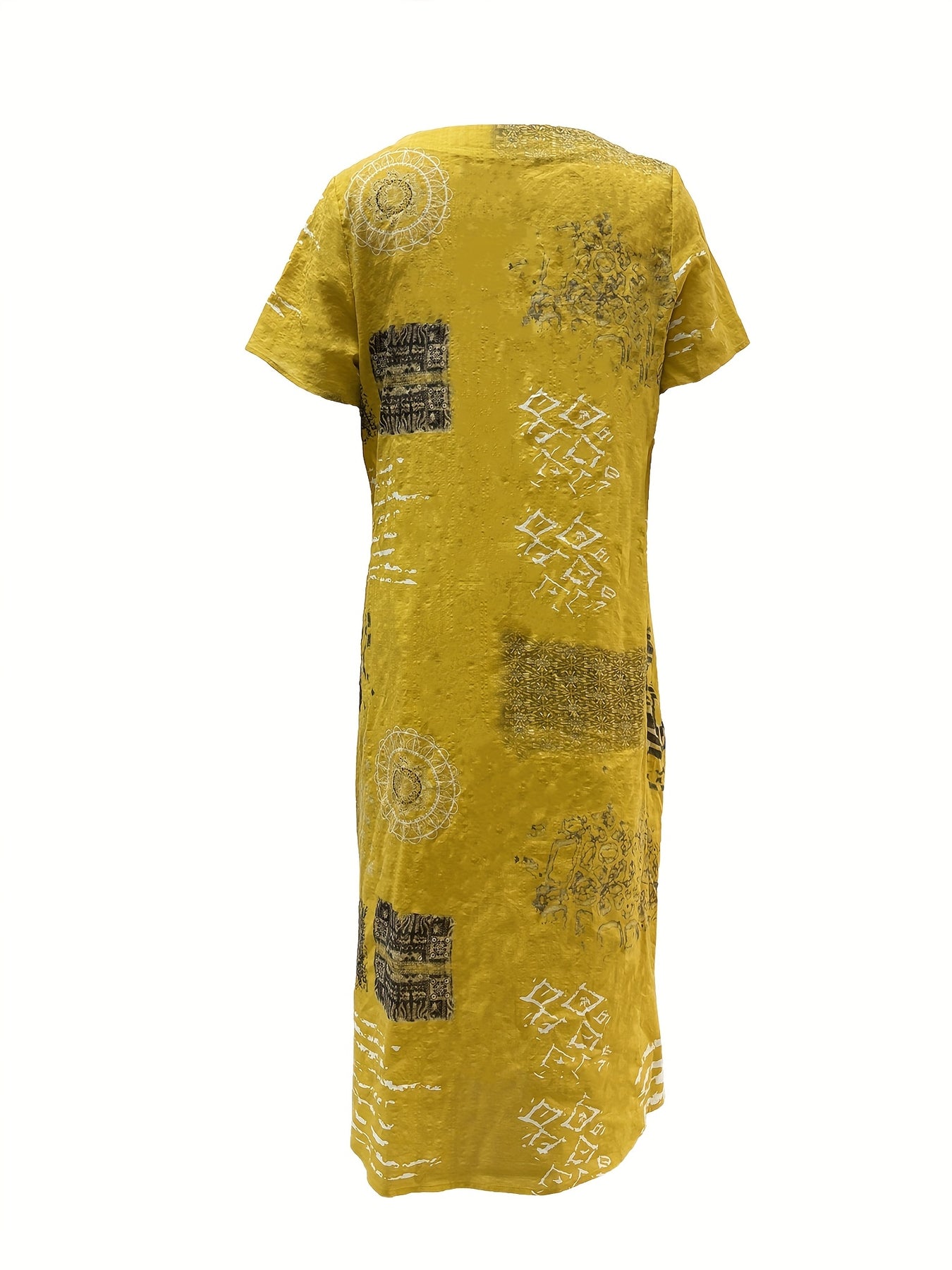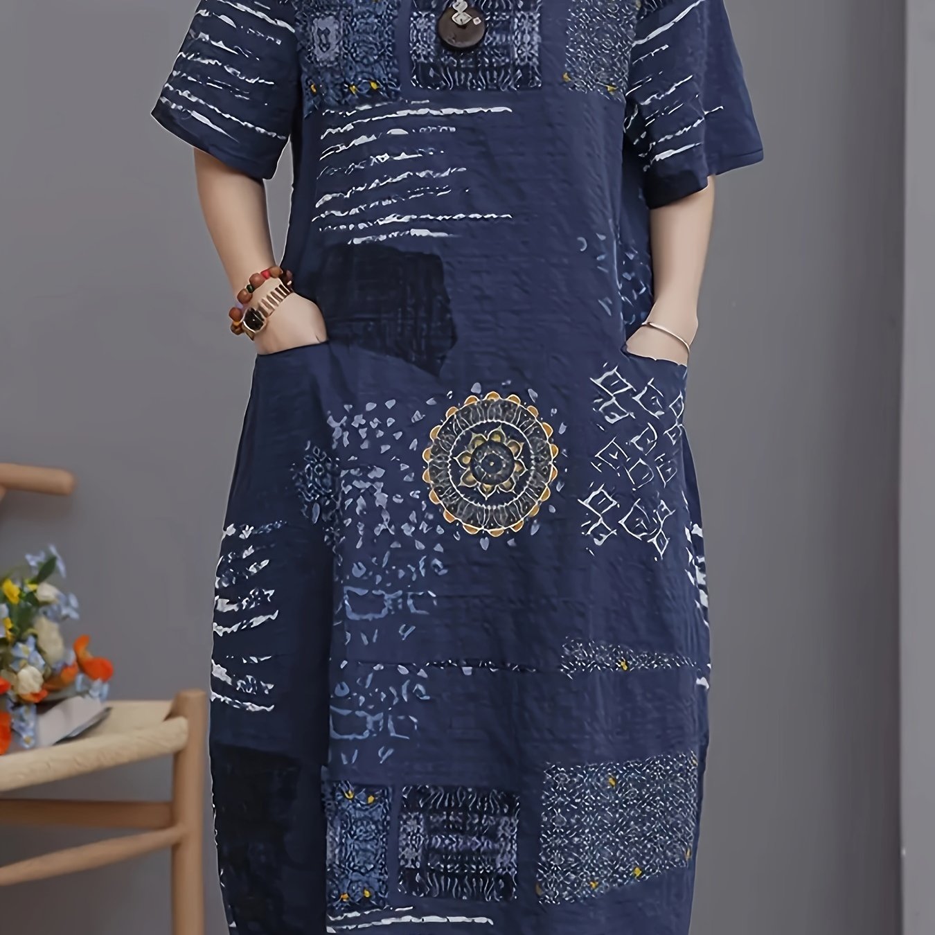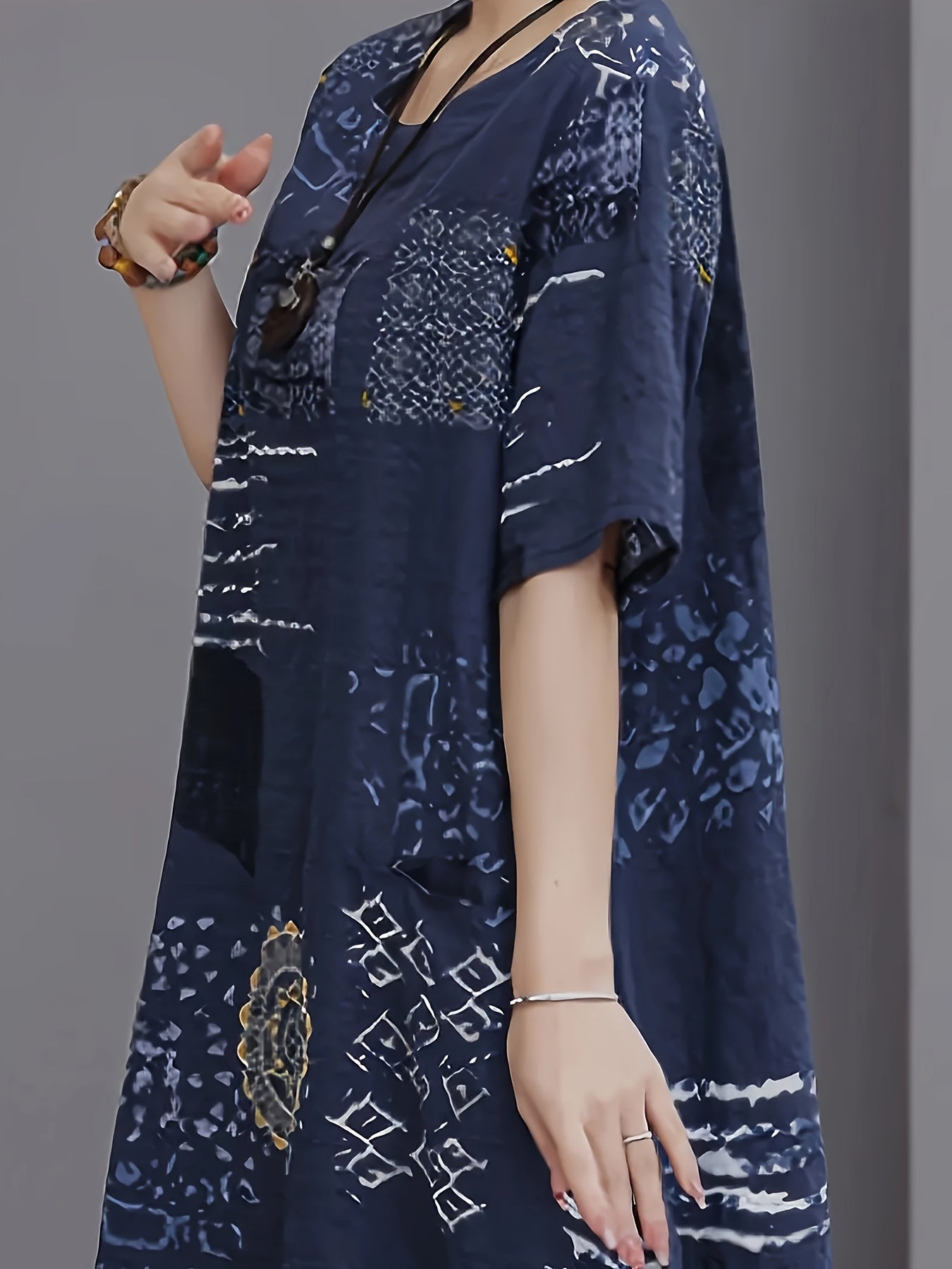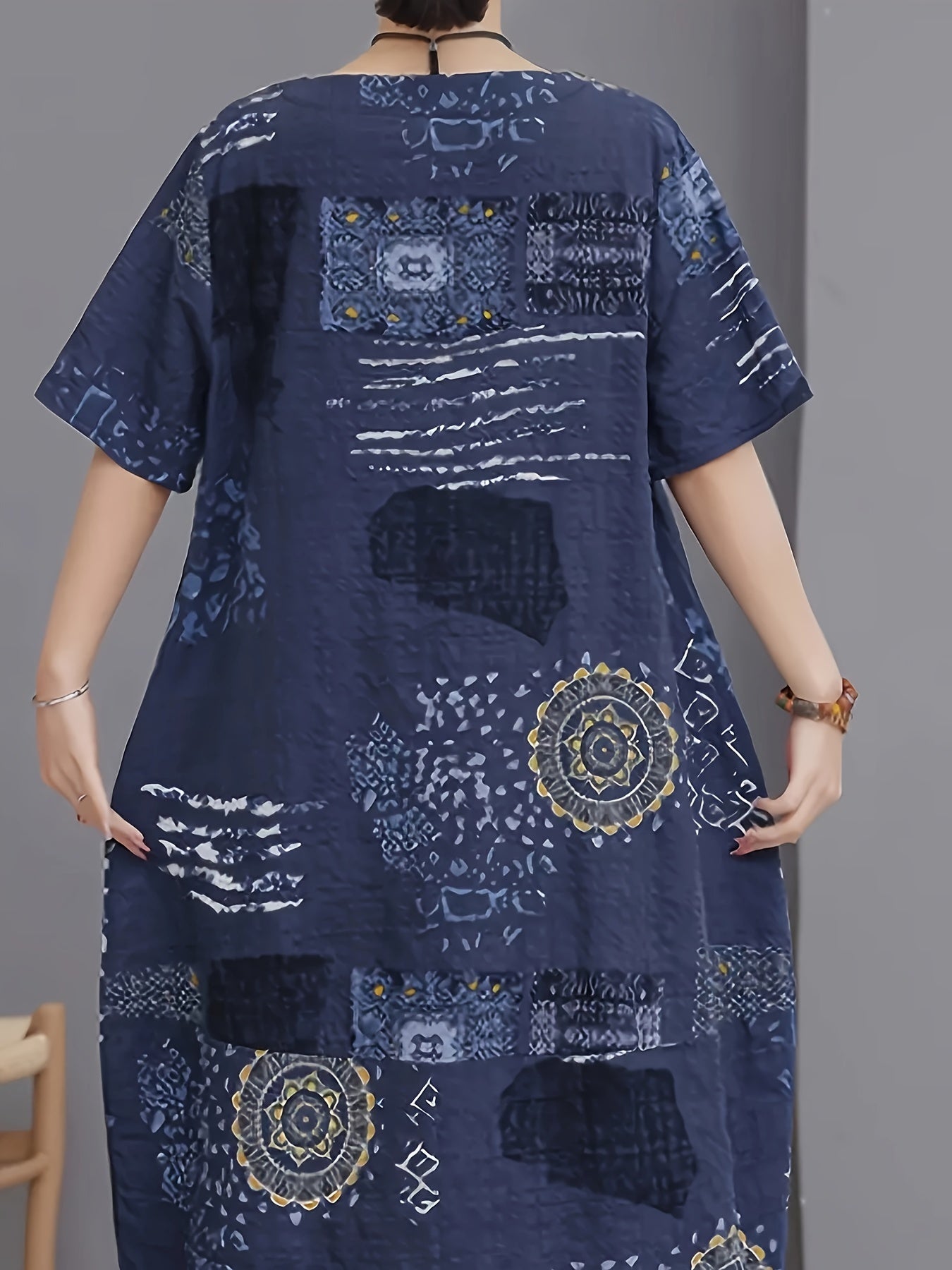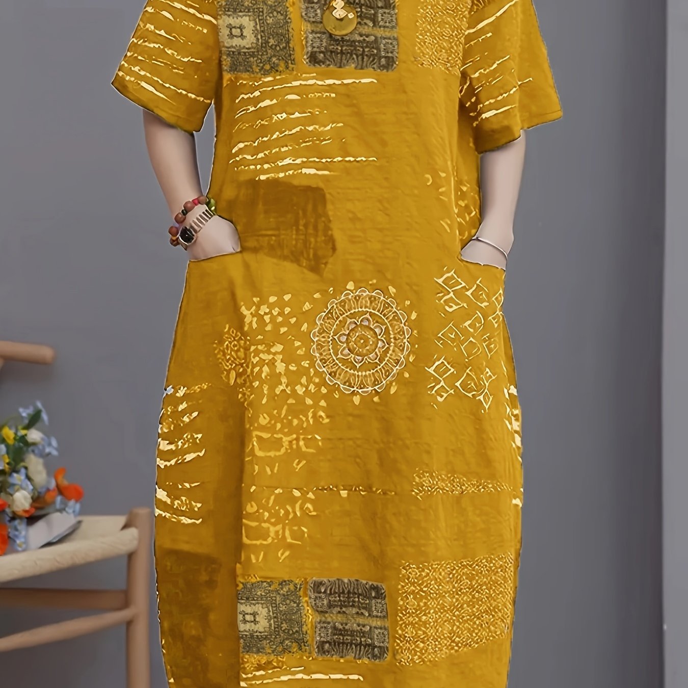 The Calyra PocketFlow Boho Midi Dress is designed for effortless spring and summer styling with a relaxed yet polished feel. Featuring a classic round neckline, short sleeves, and a flattering A-line silhouette, it offers an easy fit that feels comfortable while maintaining a smart-casual look. The mid-length cut adds versatility, making it suitable for both daytime outings and relaxed evenings.