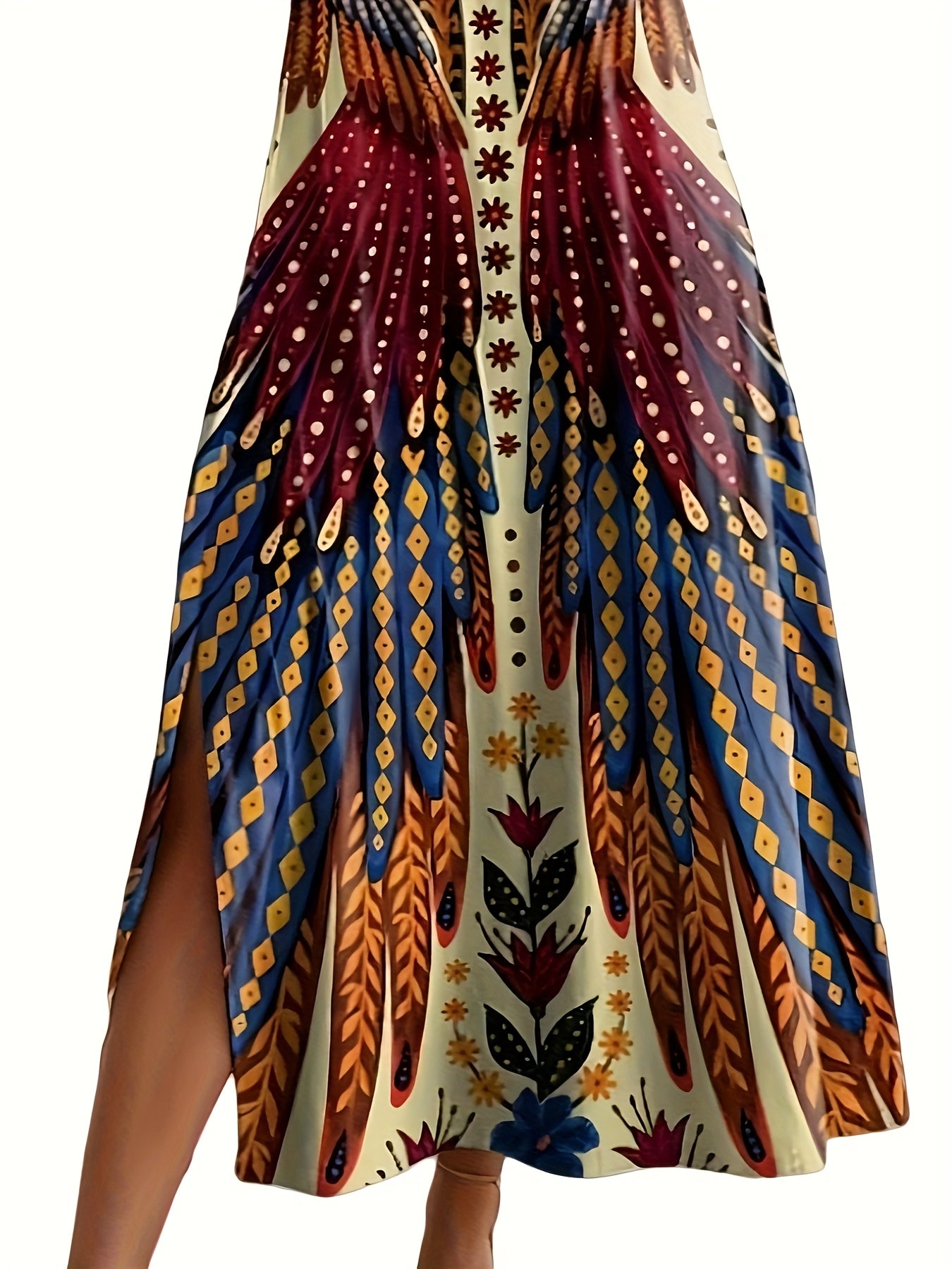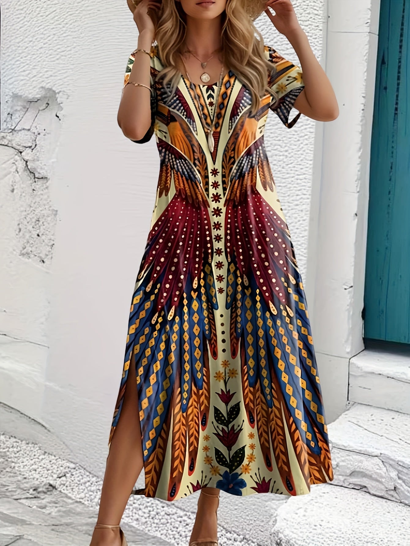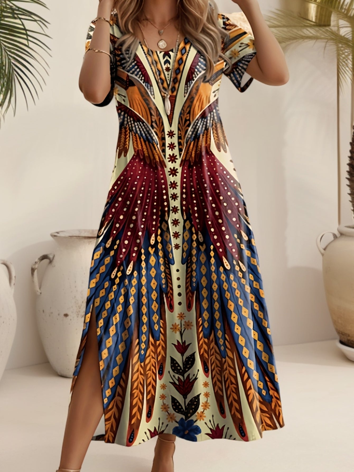 The Cylena Printline Slit Dress is designed to blend elegance with modern confidence. Featuring a classic round neckline, short sleeves, and a subtle side slit, it creates a balanced silhouette that feels refined yet expressive. The full-body print adds visual interest while keeping the overall look polished and sophisticated.