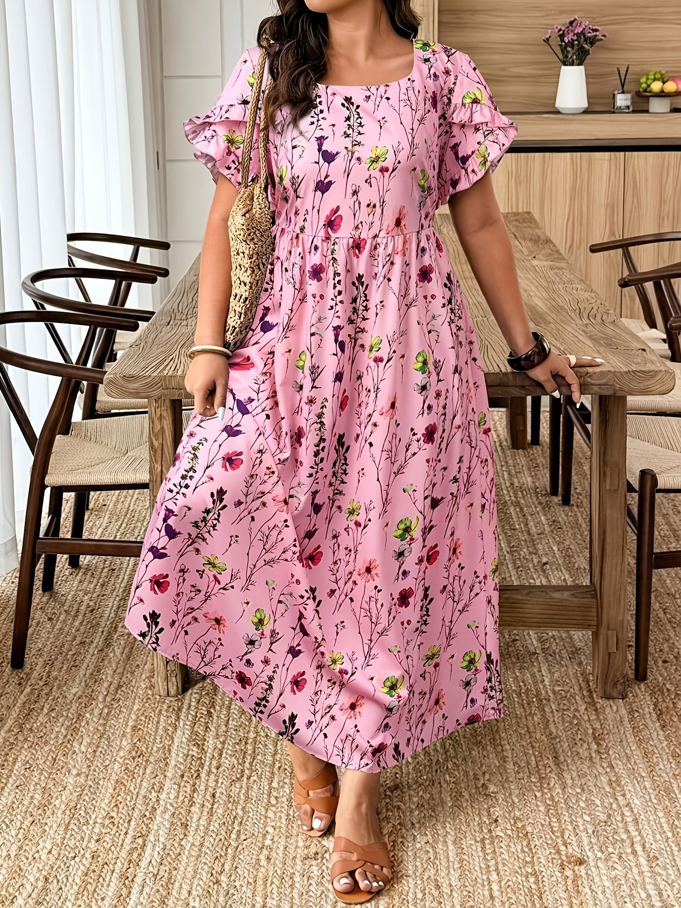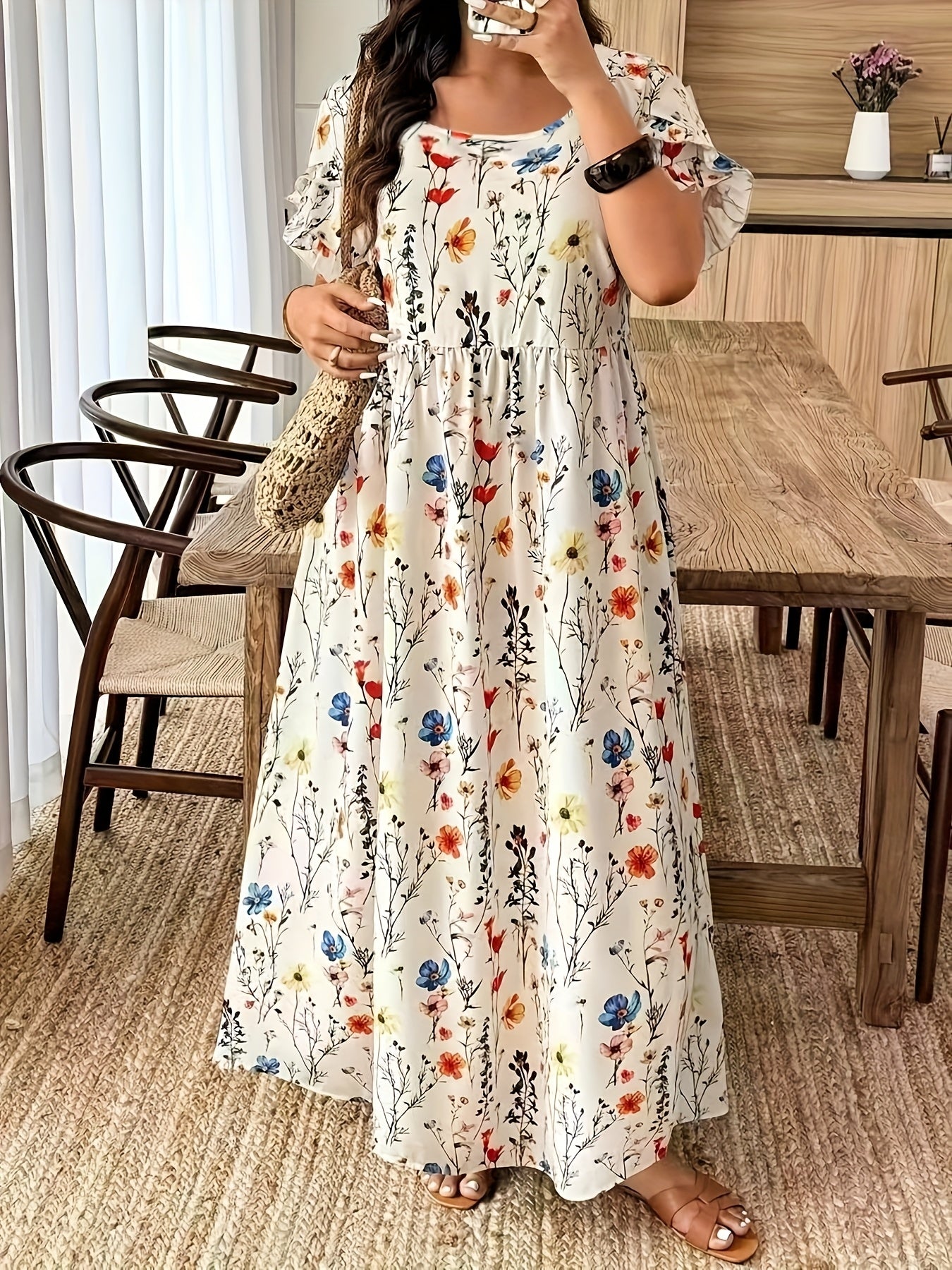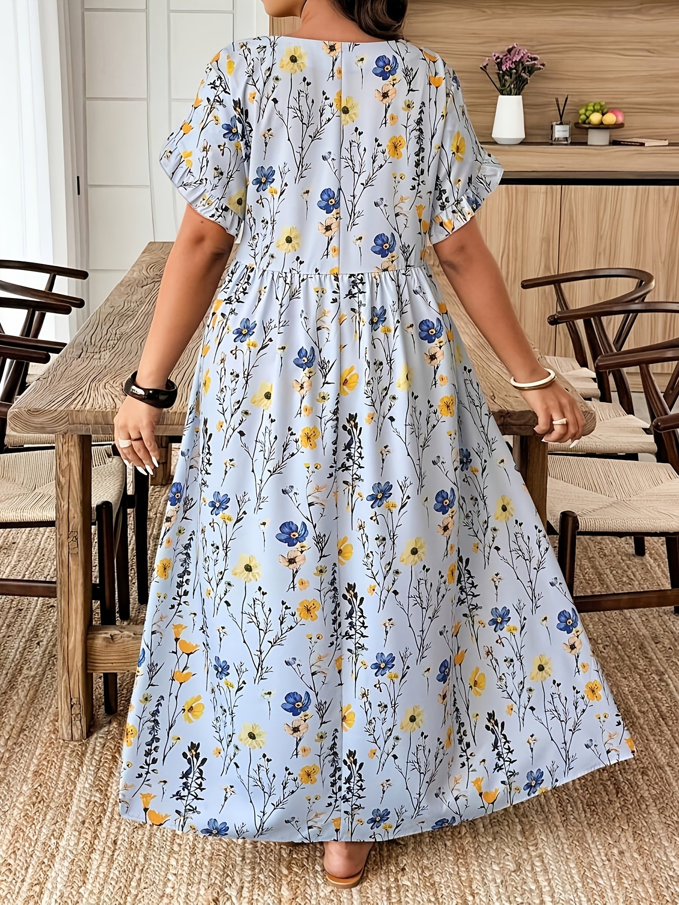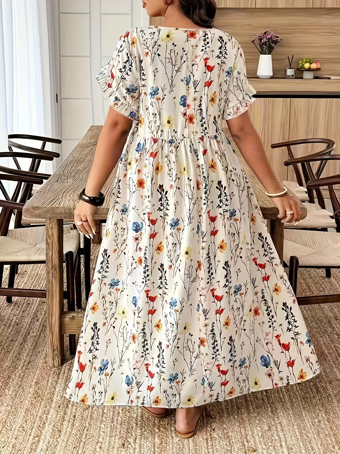 The Elvoria GraceBloom Plus Maxi Dress is designed to celebrate effortless elegance with a flattering, confidence-boosting fit. Featuring a classic round neckline and soft flutter sleeves, it creates a graceful silhouette that feels light, feminine, and beautifully balanced. The floral print adds a refined, vacation-ready charm without overwhelming the look.
