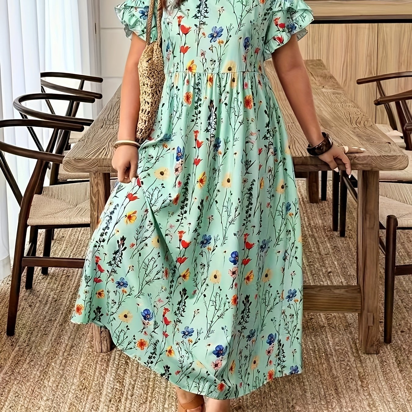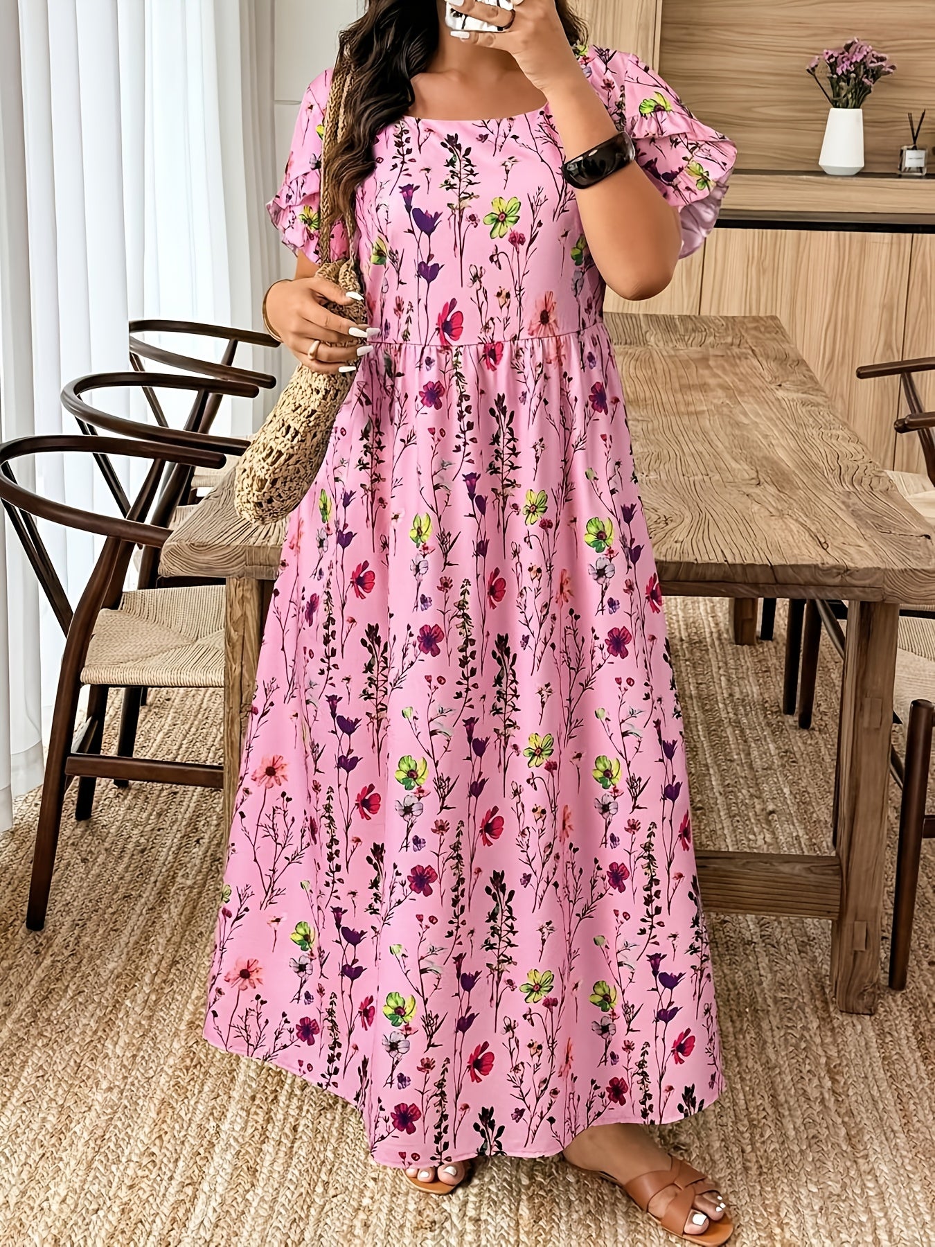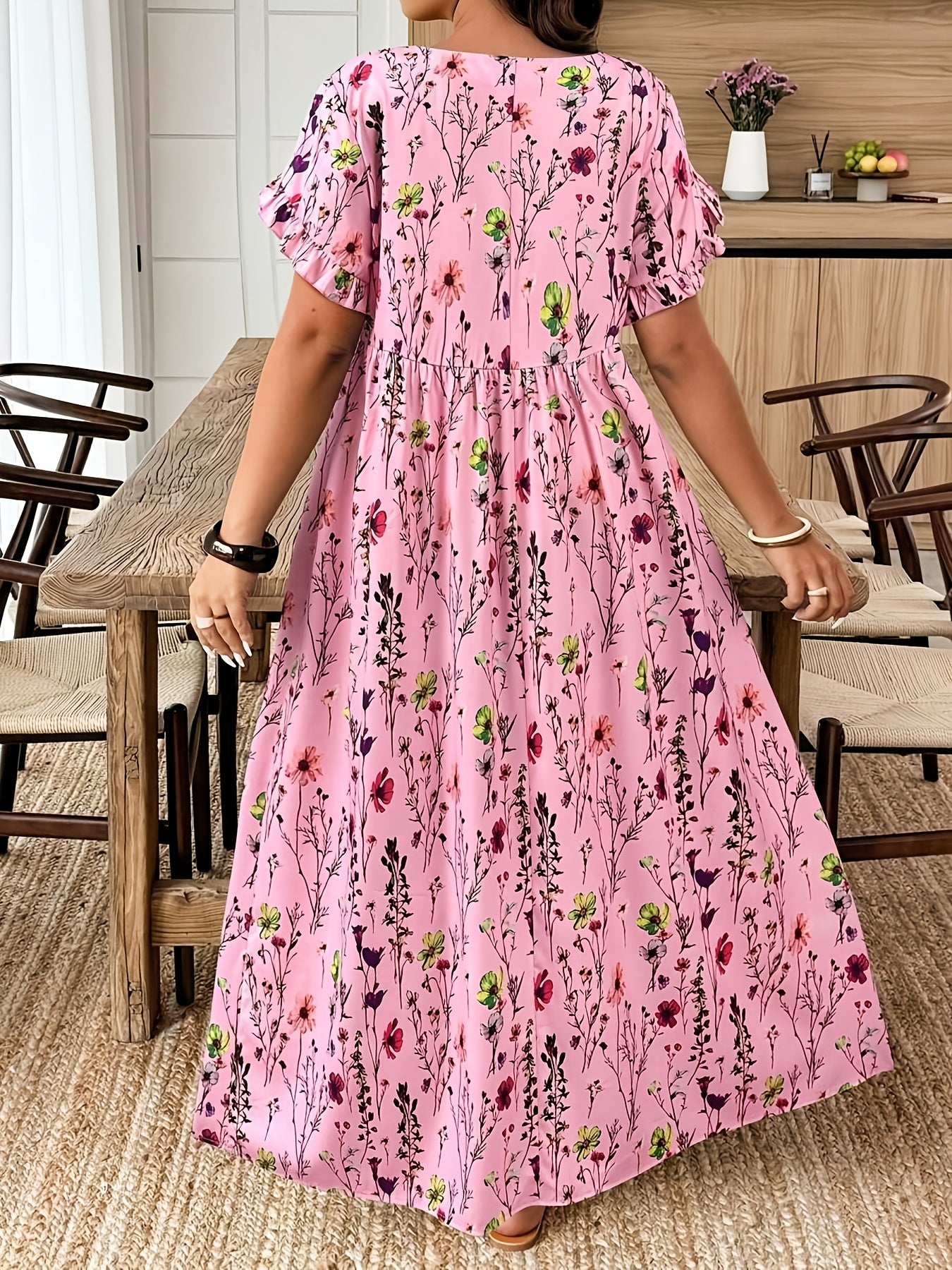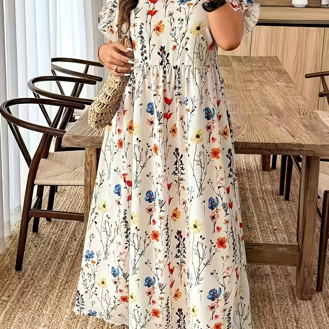 The Elvoria GraceBloom Plus Maxi Dress is designed to celebrate effortless elegance with a flattering, confidence-boosting fit. Featuring a classic round neckline and soft flutter sleeves, it creates a graceful silhouette that feels light, feminine, and beautifully balanced. The floral print adds a refined, vacation-ready charm without overwhelming the look.